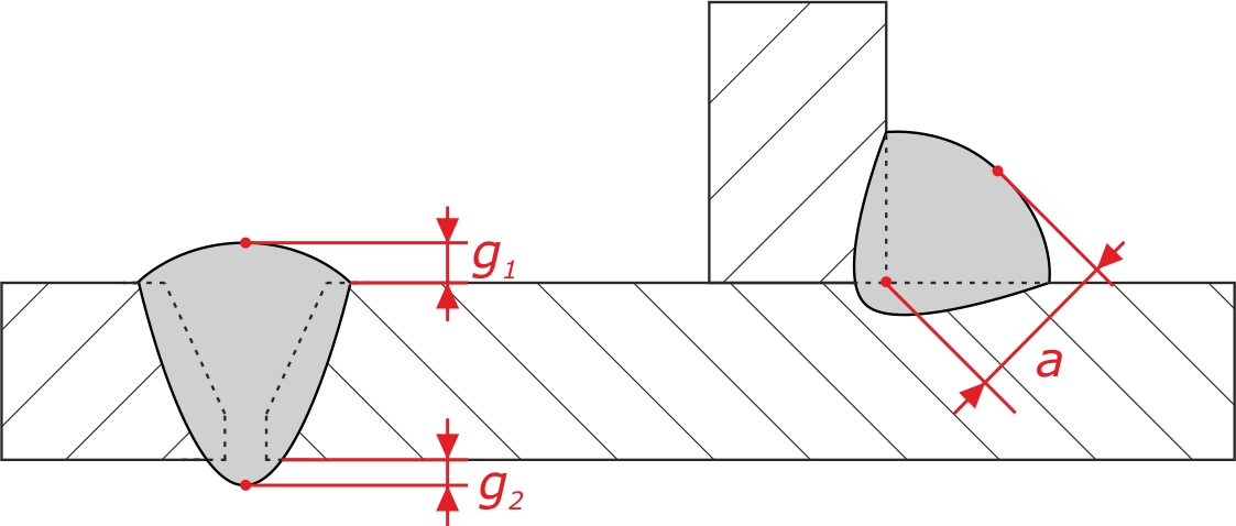 | выпуклость стыкового шва (g1) и его корня (g2), мм |