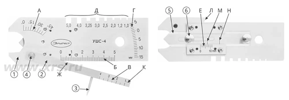 Универсальный шаблон сварщика УШС-4 предназначен для визуального и измерительного контроля стыкуемых деталей, параметров стыковых и угловых швов, дефектов и контроля диаметров электродов и сварочной проволоки. Шаблон УШС-4 является расширенной версией УШС-3: на его оборотной стороне находится дополнительный движок, позволяющий измерять фактическую толщину углового шва. Входит в состав комплектов ВИК «Эксперт» и ВИК «Поверенный».